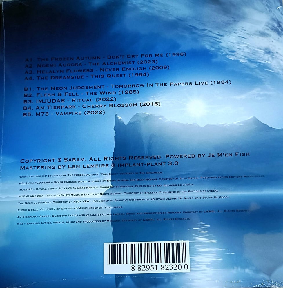 proven by the celebration of their 30th anniversary recently, and hereby featured with one of their earlier tracks ‘Don’t cry for me’. Helalyn Flowers meanwhile has been a household name signed on Alfa Matrix for 15+ years – But also present with their members’ respective solo projects ‘Noemi Aurora’ and ‘IMJUDAS’ (Both also under Alfa Matrix / Spleen+). Belgian projects this time around in The Neon Judgement’s cult track ‘Tomorrow in the papers’ in a live rendition, dating back all the way to 1984, as well as Flesh & Fell’s ‘The Wind’ from their sought after 1985 release on Scarface ; The Netherlands, meanwhile, is represented with The Dreamside’s ‘This Quest’, an 8-minute ethereal rendition going all the way back to their 1996 ‘Apaika’ (Nuclear Blast) release. Last but not least, Denmark-based projects are featured with Am Tierpark’s ‘Cherry Blossom’ (A cooperation between Mirland and Leaether Strip’s Claus Larsen) and Mirland’s recent new track ‘Vampire’ under his M73 Monniker.